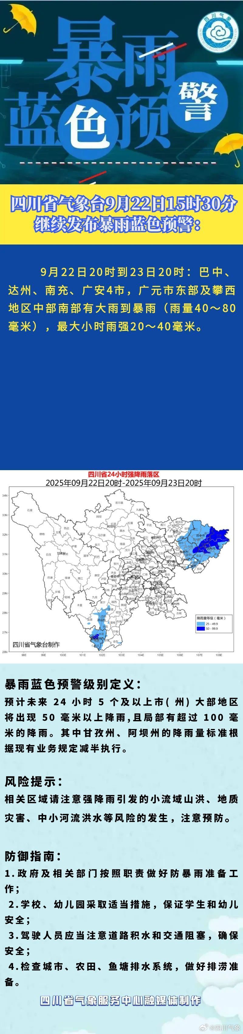 四川省气象台9月22日15时30分继续发布暴雨蓝色预警:
