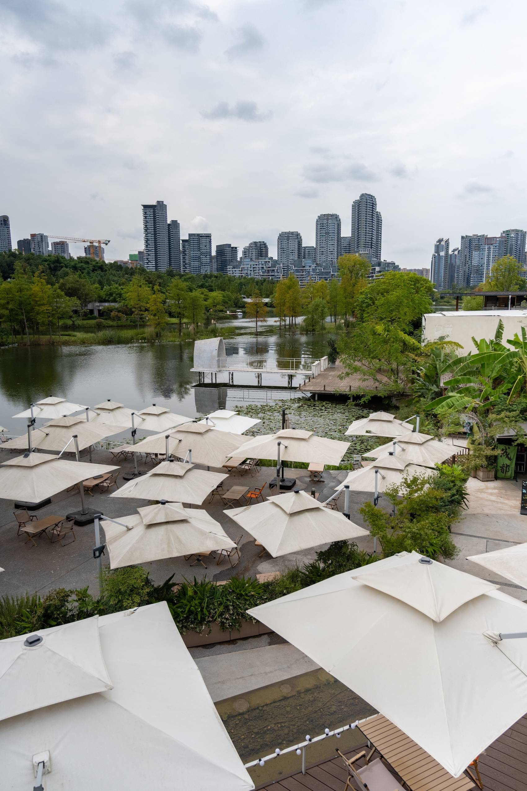 王良云告诉我:“定位是‘天府人自己的美食街’,从价格到体验都围绕追求高品质、微度假体验的本地年轻人和家庭客群。”他进一步举例说,在价格上,主打“高品质性价比”,人均80-100元,搭配用料扎实的菜品,让消费者觉得‘不便宜但很值’。”环境上,街区紧扣“出片”和“亲子”两大核心。明档厨房、中式风格,店铺沿湖岸线排列,营造出适合拍照打卡的轻松氛围。对于家庭客群,街区提供儿童餐椅和餐具,将用餐体验与整个麓湖生态城的亲子业态有效联动。“‘吃’只是一站式微度假的环节,而非唯一目的。”他对此解释说。