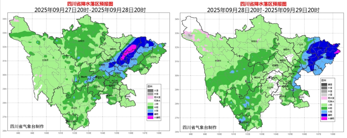 预计在9月28日至29日会有一次明显的降水天气过程,盆地大部地方有小到中雨,其中北部、中部有大雨到暴雨,局部大暴雨;川西高原和攀西地区的部分地方有小到中雨,局地大雨。