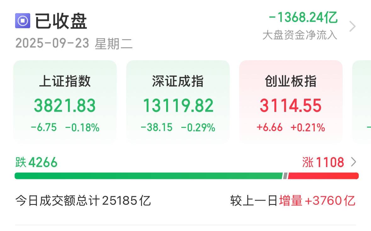 9月23日,A股三大指数涨跌不一。截至收盘,上证指数跌0.18%,收报3821.83点;深成指跌0.29%,收报13119.82点;创业板指涨0.21%,收报3114.55点。全市场全天成交额25185亿元,较上日放量3760亿元。下跌个股数量逾4200只,市场亏钱效应显著。从跌幅分布看,主要集中于0至3%区间,共3128只;跌幅在3%至5%的个股其次,为893只。