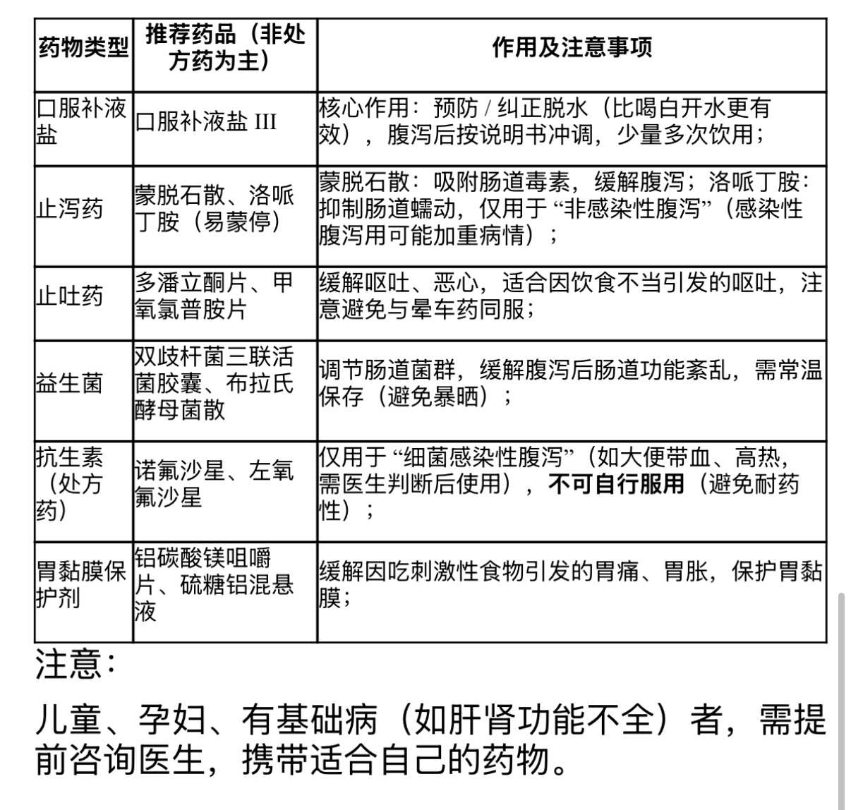 记者:旅行药箱中,针对肠胃问题应该常备哪些药物?