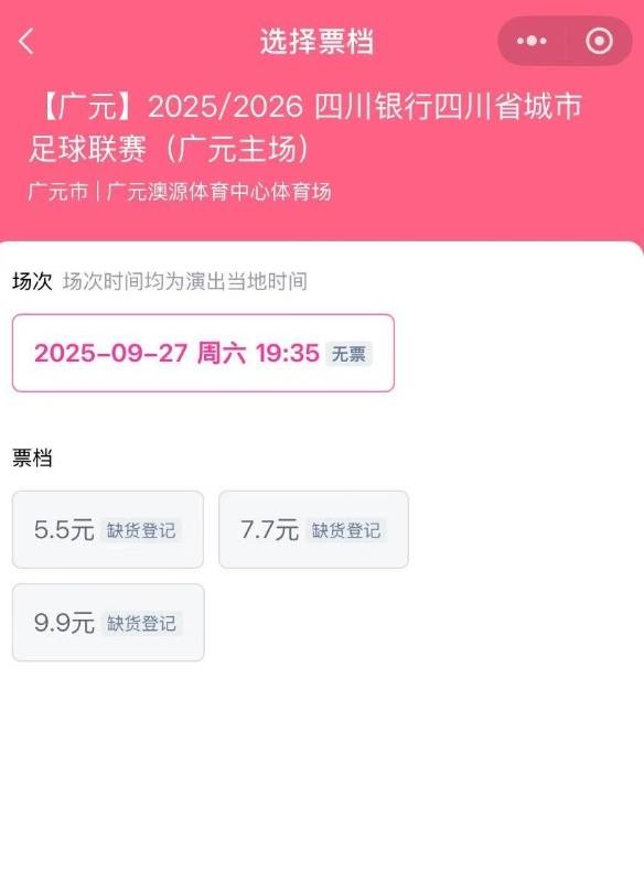 川超广元主场的门票价格为:5.5元,7.7元,9.9元。目前首场对阵绵阳比赛的球票已售罄。