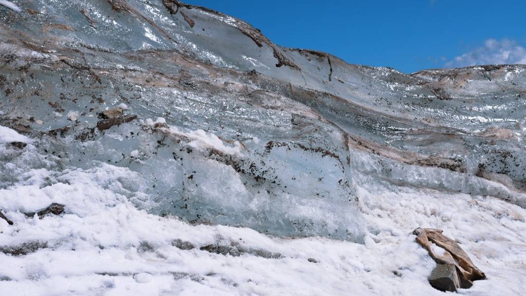 此外,科研人员在对2024年的实验区域进行测量时发现,辐射制冷材料保护区域的冰层在太阳光下呈现杂质较少的蓝色,相较于周边冰碛物较多的灰冰区域,最大的高度差接近5米。