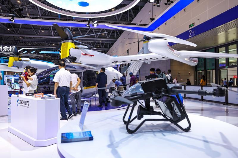 9月25日,观众在第四届全球数字贸易博览会数智出行展区参观无人机。