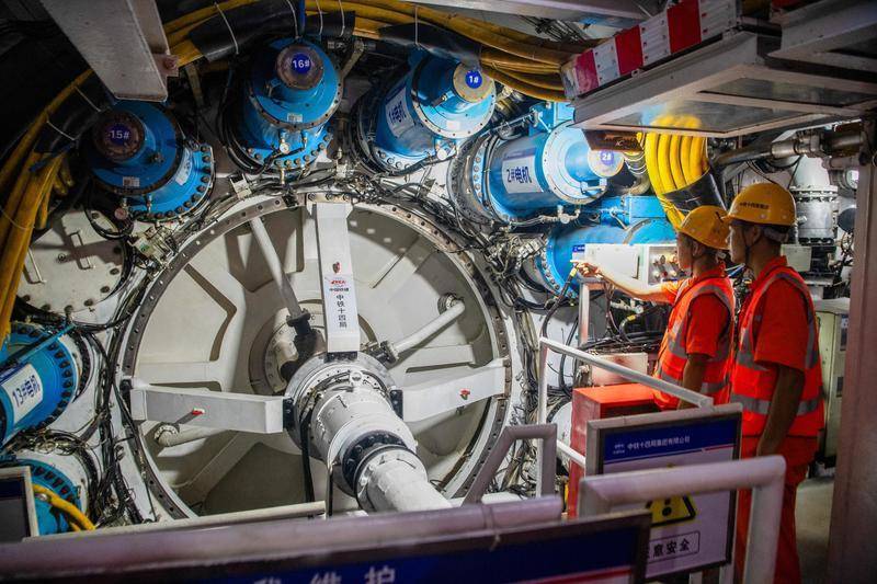 9月25日,工人在渝厦高铁重庆菜园坝长江铁路隧道建设现场施工作业。
