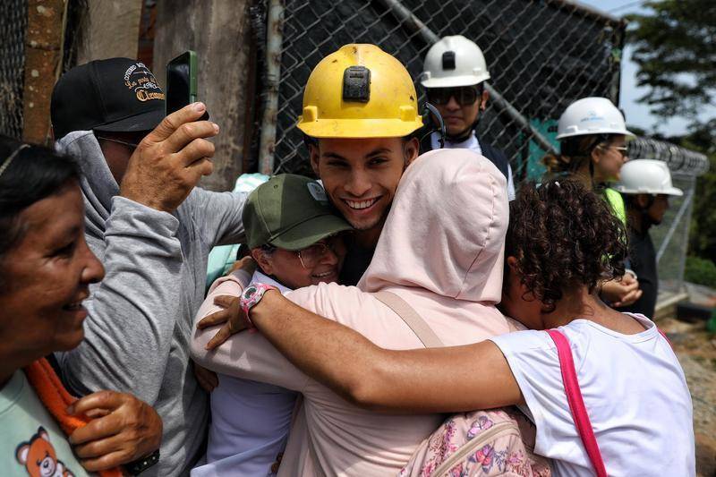 9月24日,在哥伦比亚塞哥维亚市,获救矿工拥抱家人。