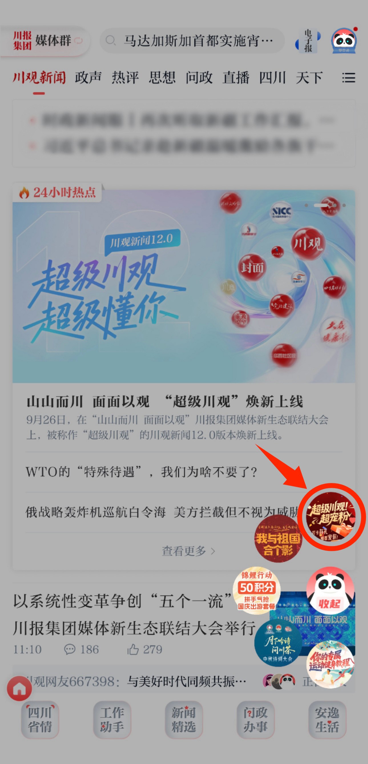 方式一:在川观新闻首页,点击右下方悬浮球,找到“超级川观超宠粉”活动图片,点击参与活动即可参与;