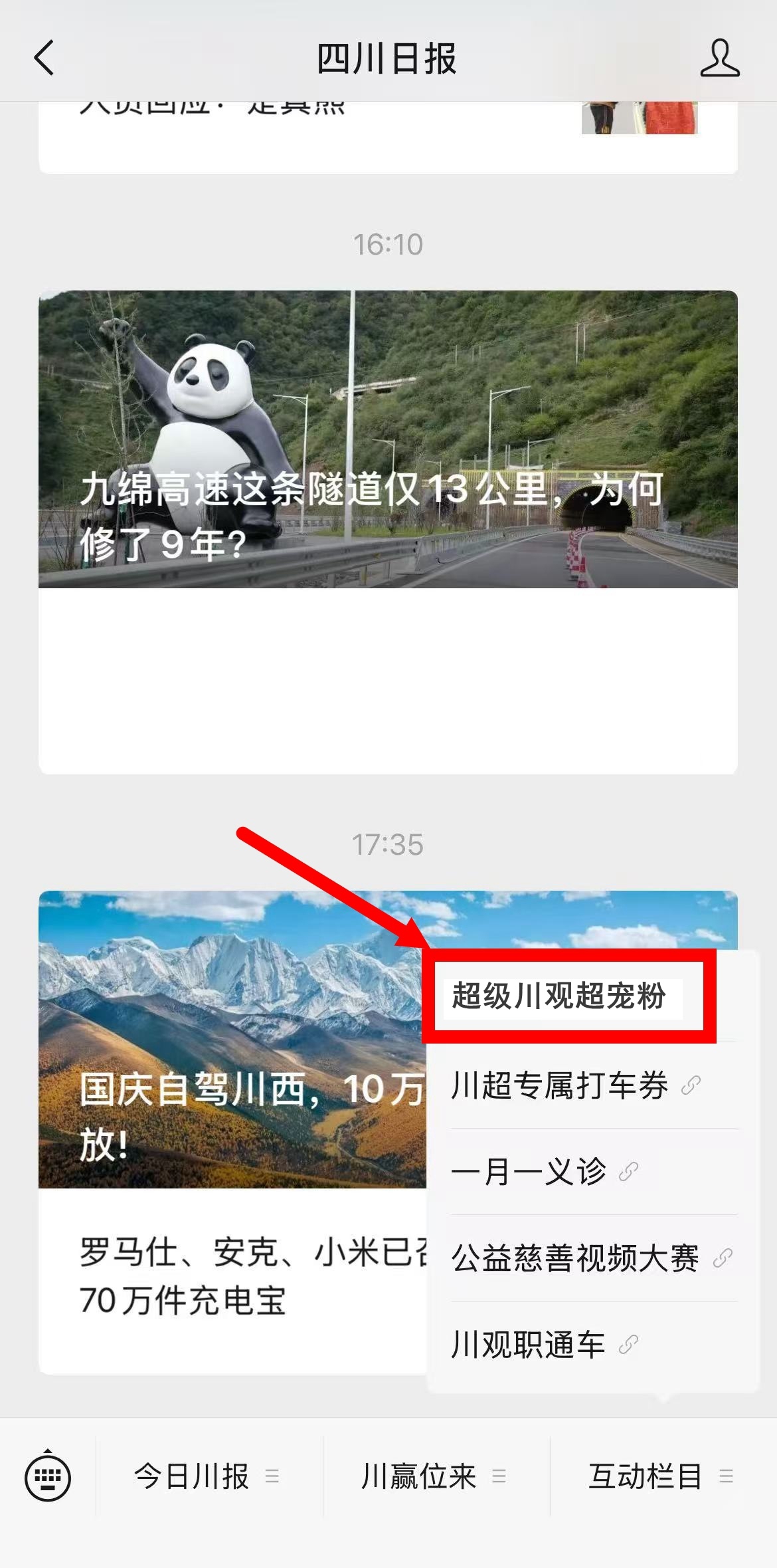 第二步:进入菜单栏选择“互动栏目”,点击“超级川观超宠粉”,点击即可参与活动。
