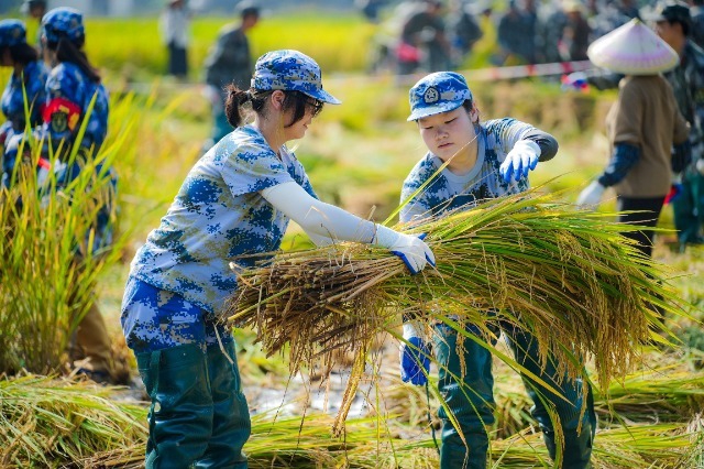 在行军拉练中,同学们步履不停,沿途沉浸式感受乡村振兴与现代农业的鲜活图景。在田间地头,同学们弯腰执镰,采收玉米、收割水稻,小组协作,全程投入,辛勤劳动过后,收获的不仅是作物,还有一次难得的成长经历。