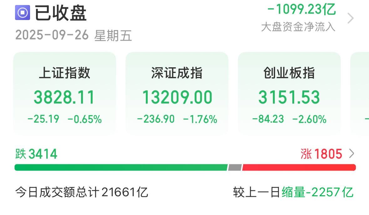 9月26日,A股三大指数集体下跌。截至收盘,上证指数跌0.65%,收报3828.11点;深成指跌1.76%,收报13209.00点;创业板指跌2.6%,收报3151.53点。全市场全天成交额21661亿元,较上日缩量2257亿元。全市场超3400只个股下跌。