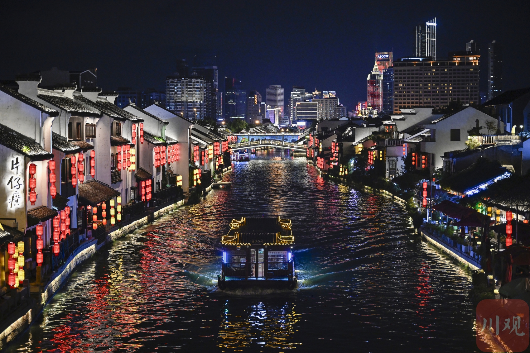 9月23日晚,无锡市清名桥古运河景区,老街巷与远处的城市高楼相映成趣。