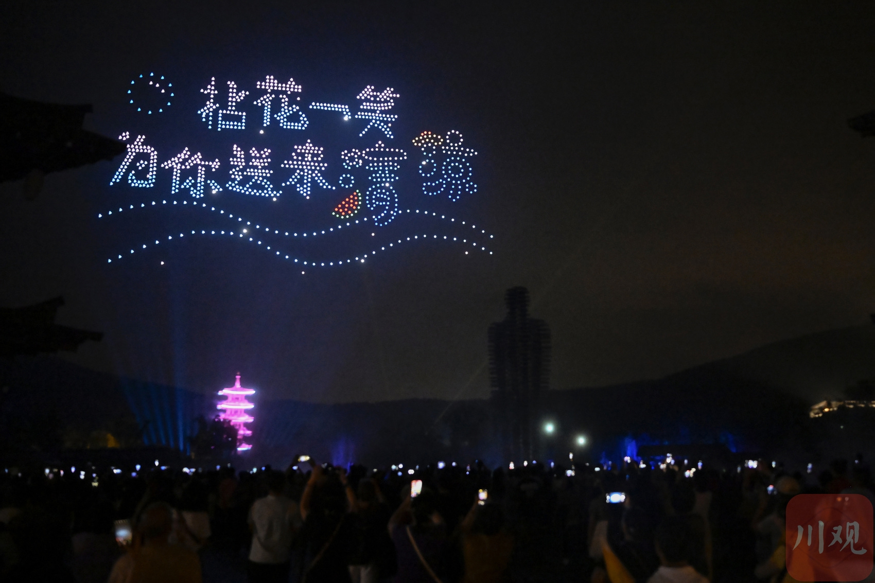 9月24日晚,无锡市拈花湾•禅意小镇内无人机表演吸引众多游客观看,黑夜里的手机屏幕仿佛点点星光。