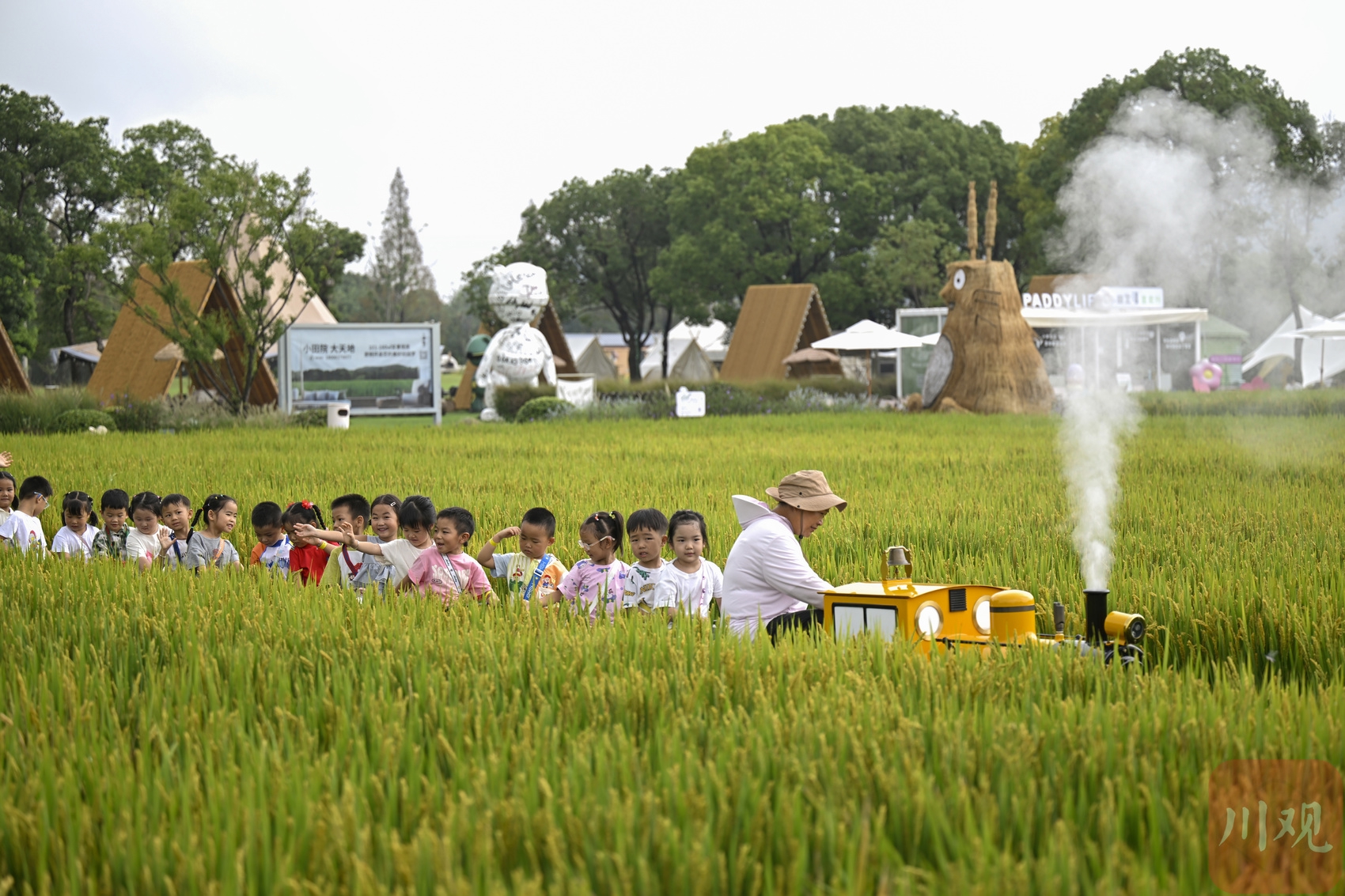 9月24日,无锡市小田蜜农场,小朋友们乘坐小火车在稻田里畅意遨游,感受田野课堂的乐趣。
