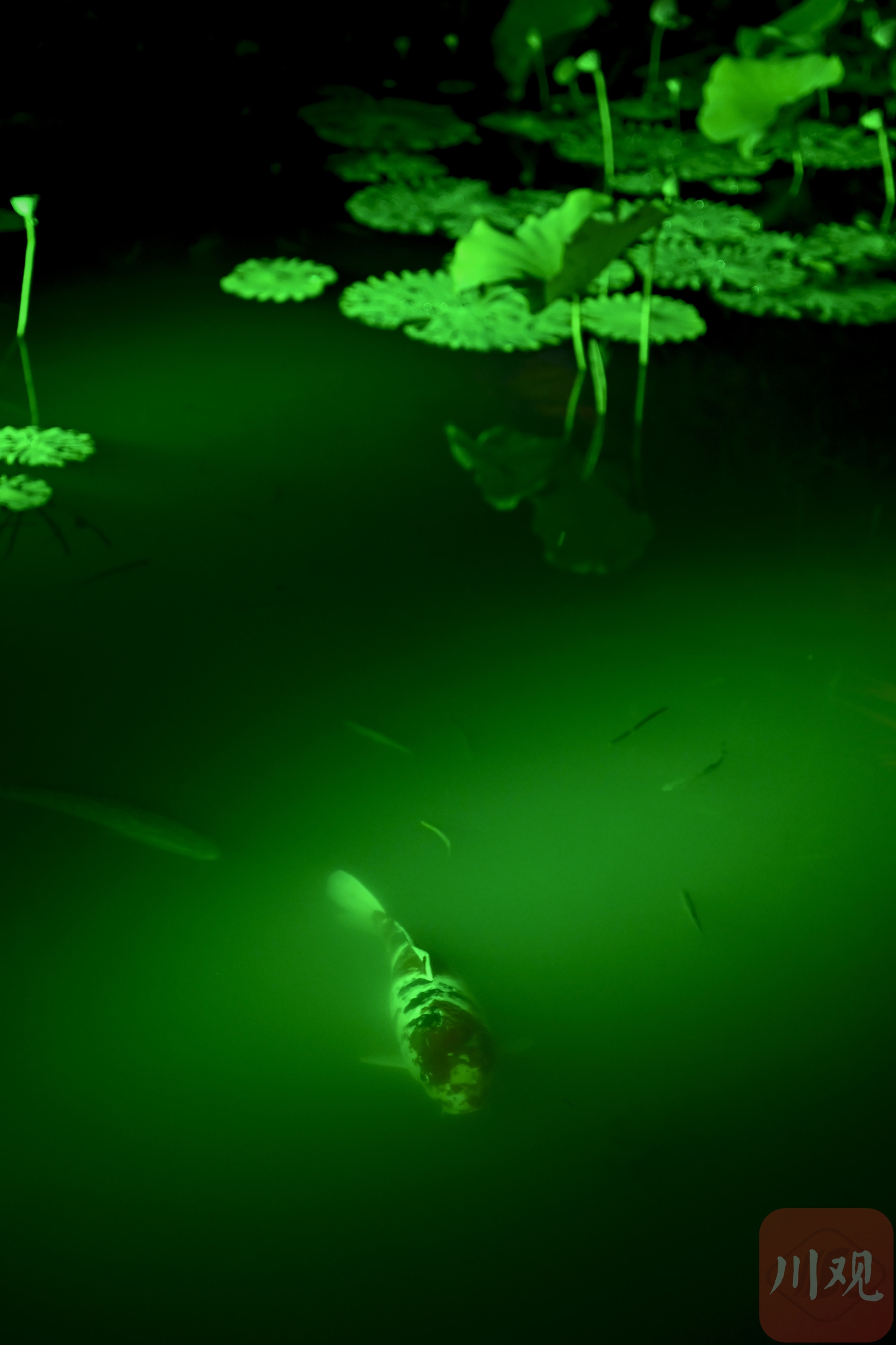 9月25日晚,无锡市拈花湾·禅意小镇内,锦鲤、荷叶与光影相映成趣。