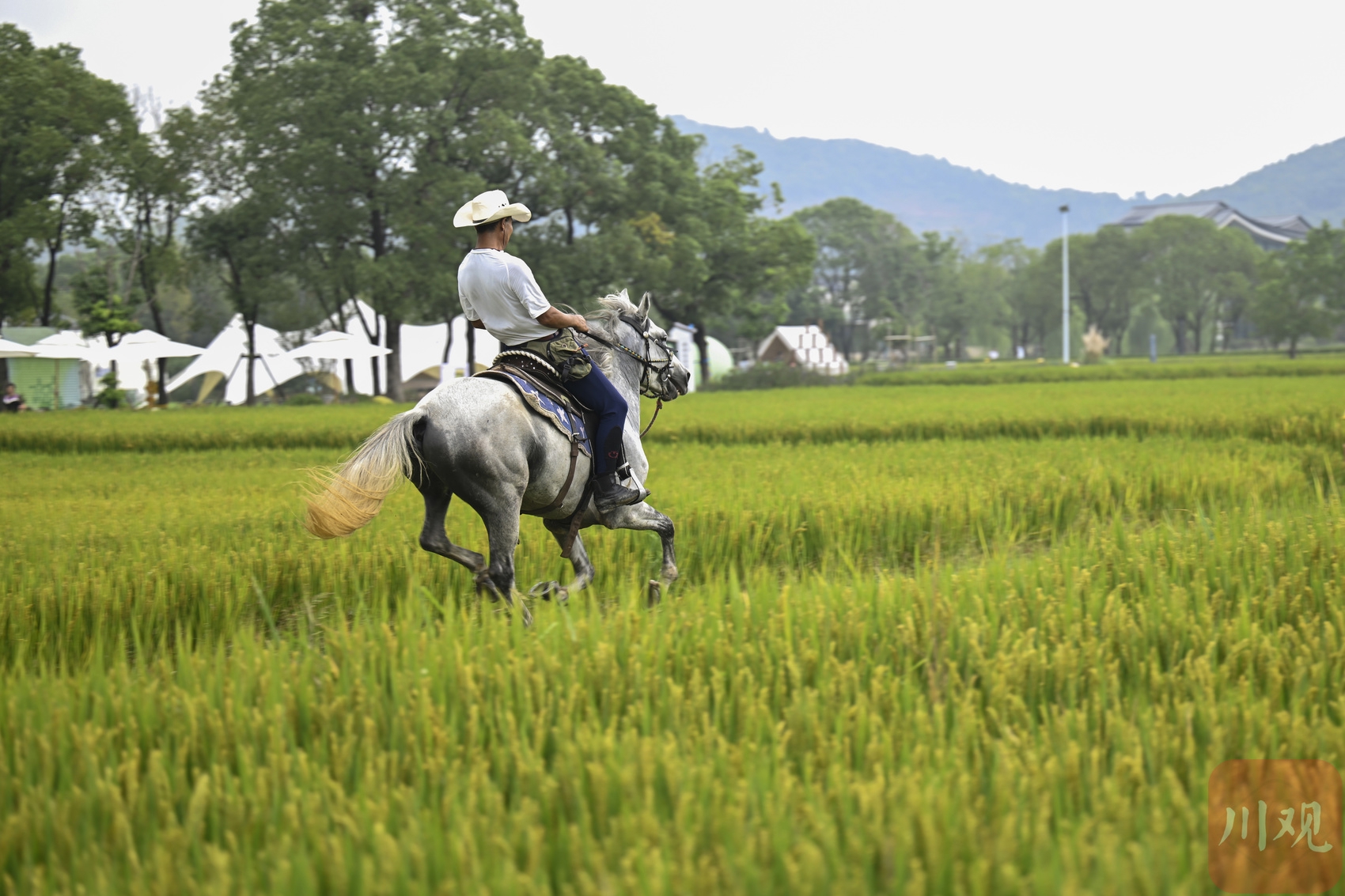 9月25日,无锡市小田蜜农场,游客在稻田里策马飞奔,体验不一样的田园生活。