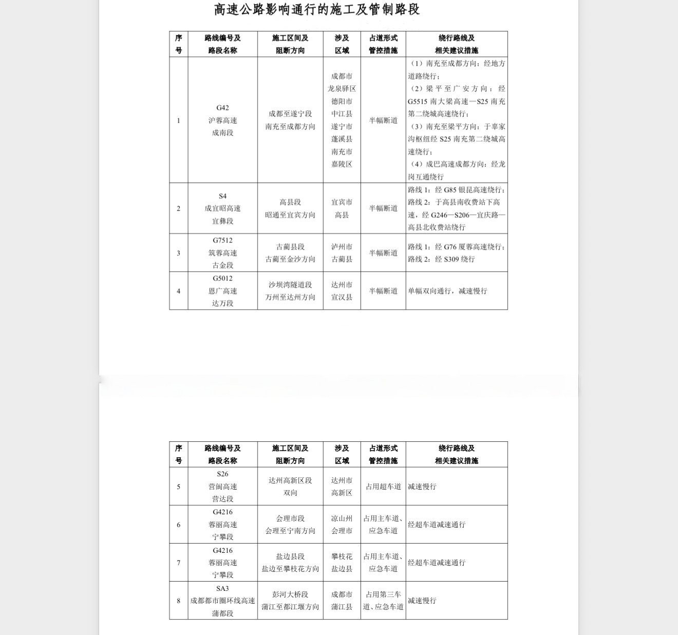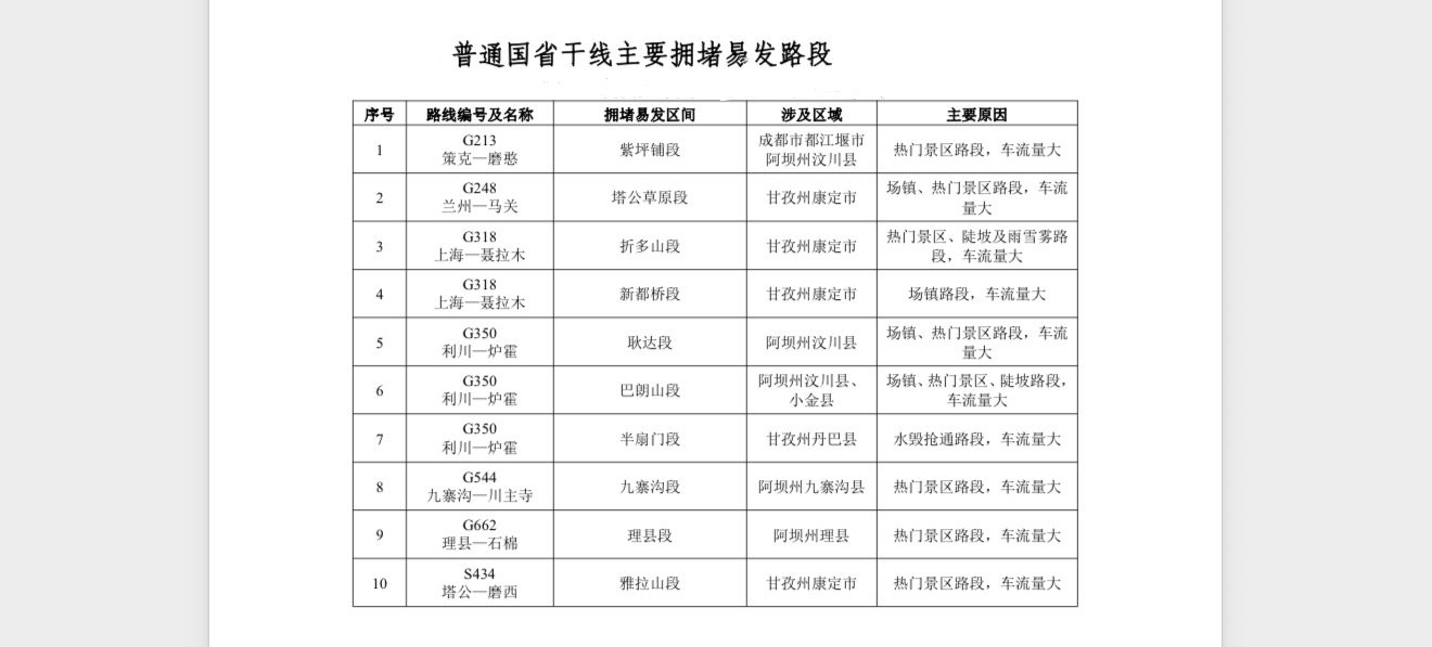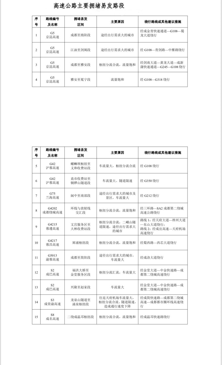 记者从四川高速公安获悉,高速公路、普通国省干线方面,以下路段容易出现拥堵: