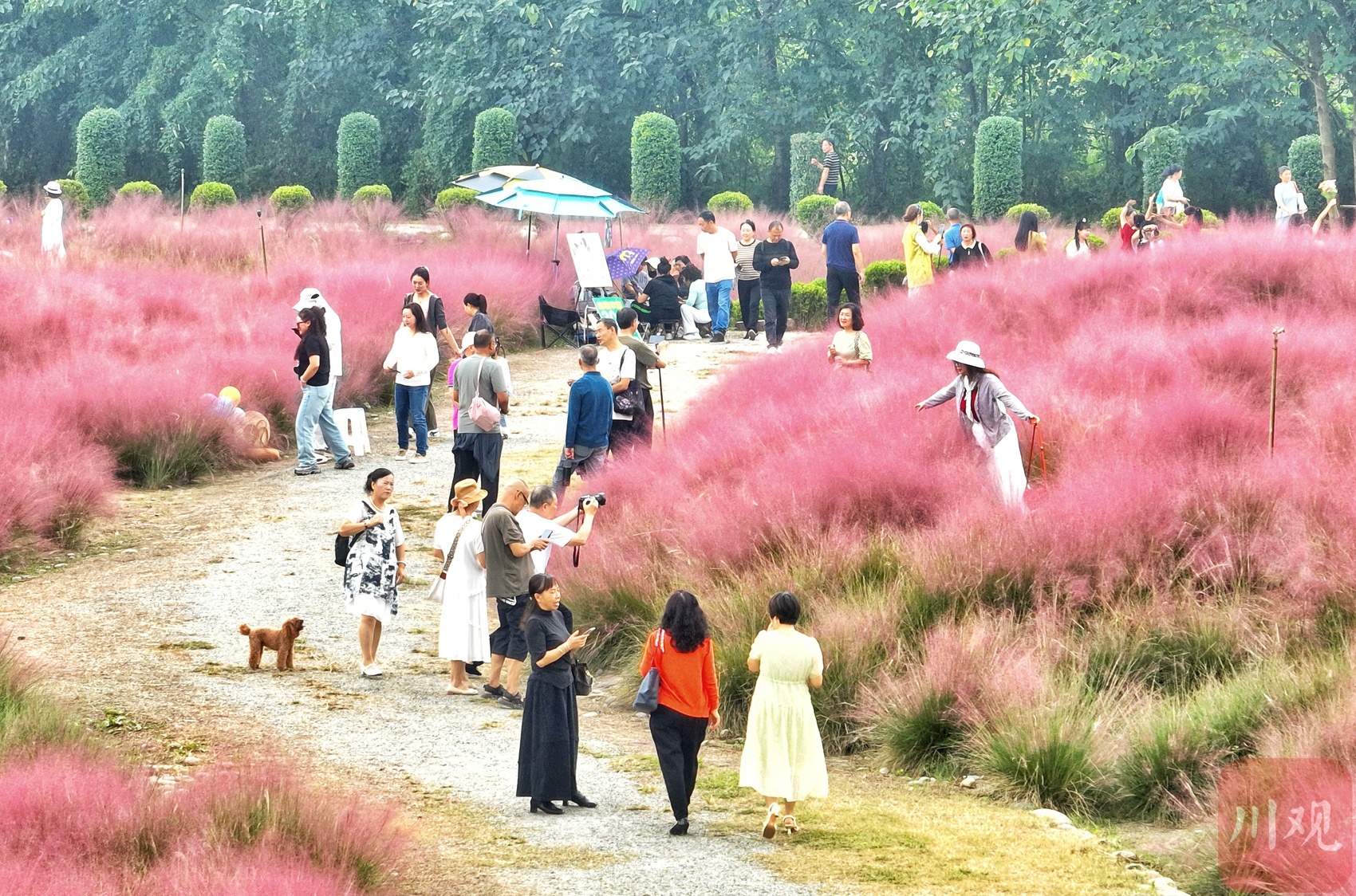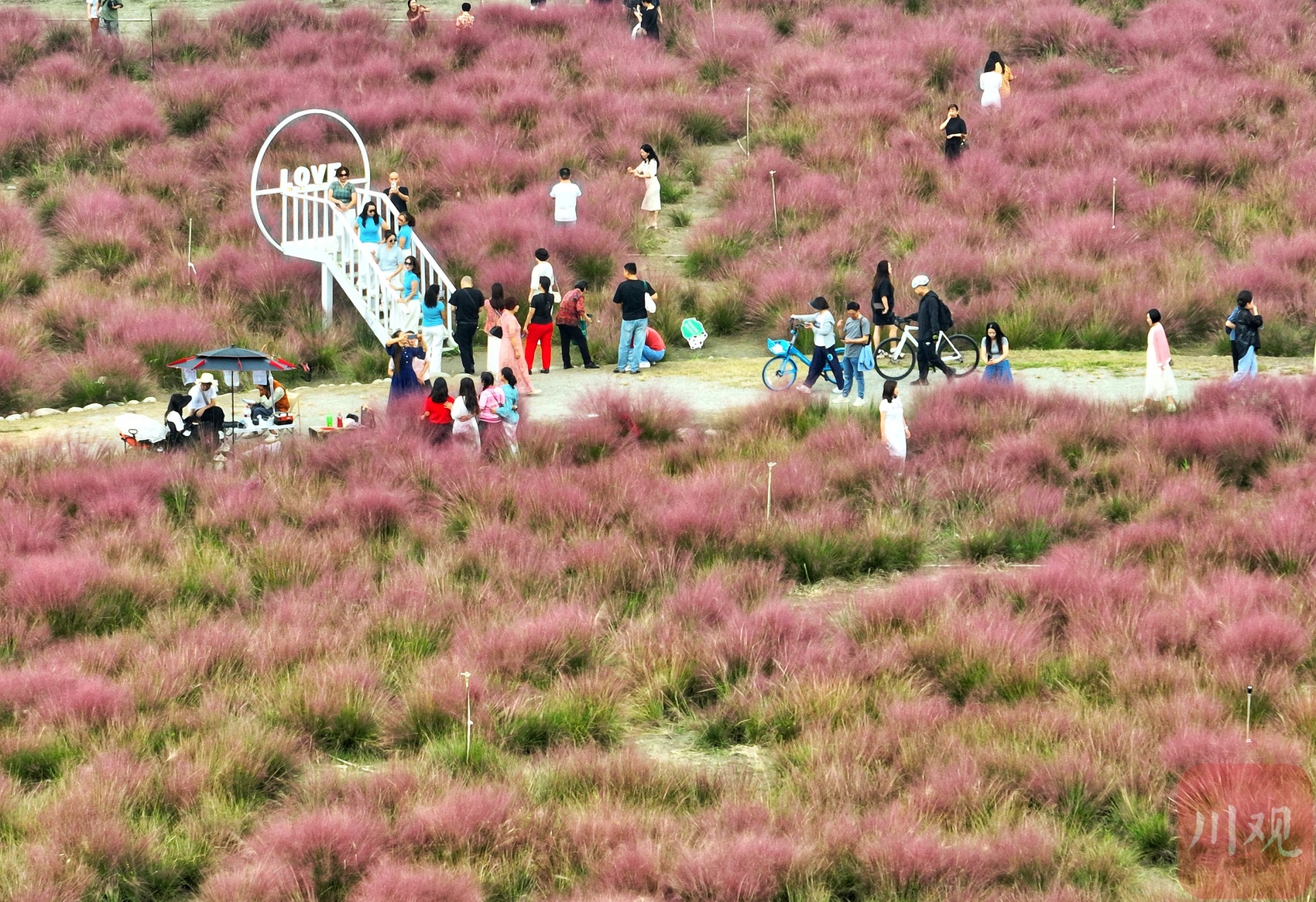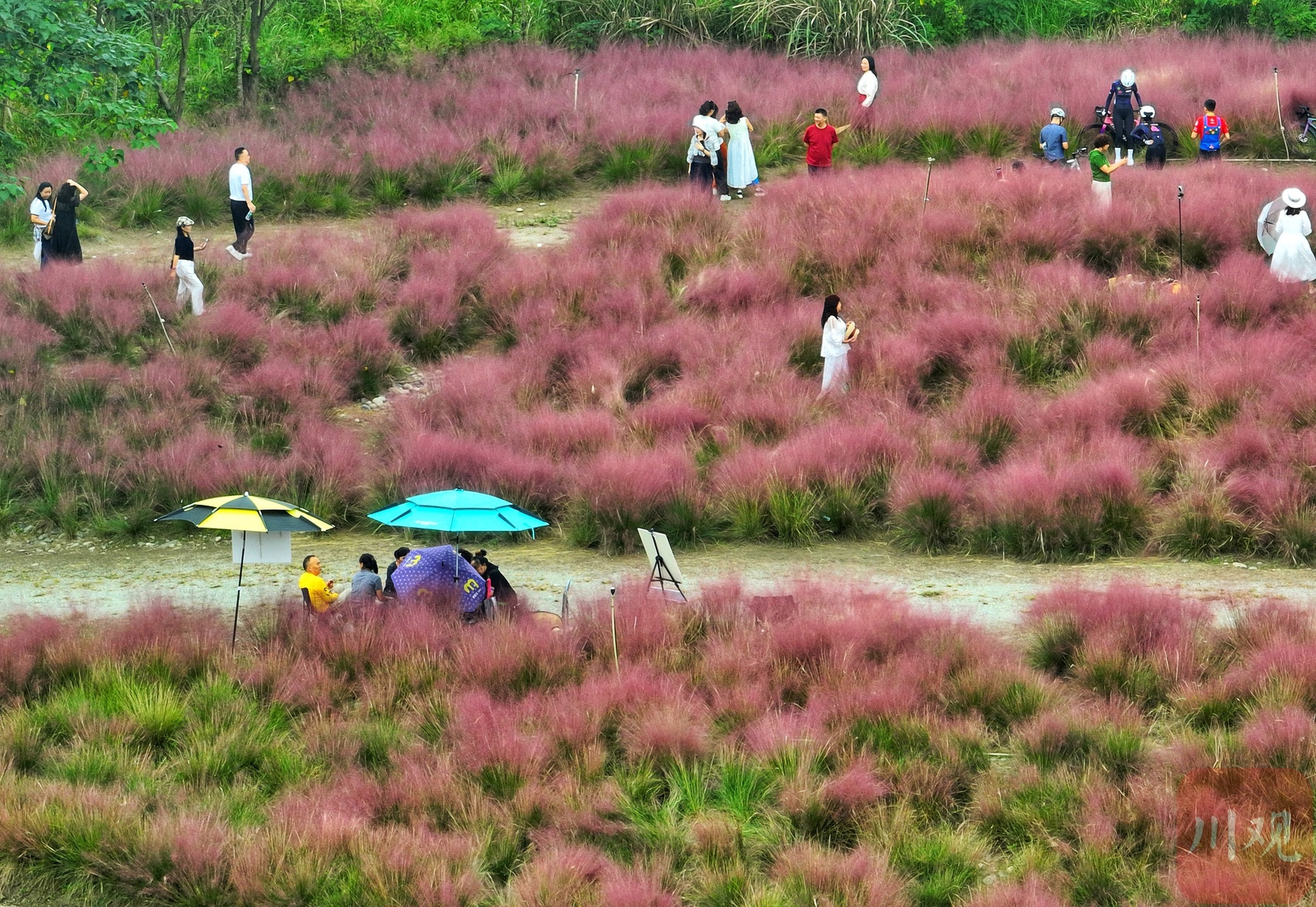 9月27日,正值周末,成都温江区汪家湾花海进入赏花季。成片的粉黛乱子草呈现出浪漫的粉色云雾状景观,在网络上迅速走红,吸引众多市民前往观光打卡。