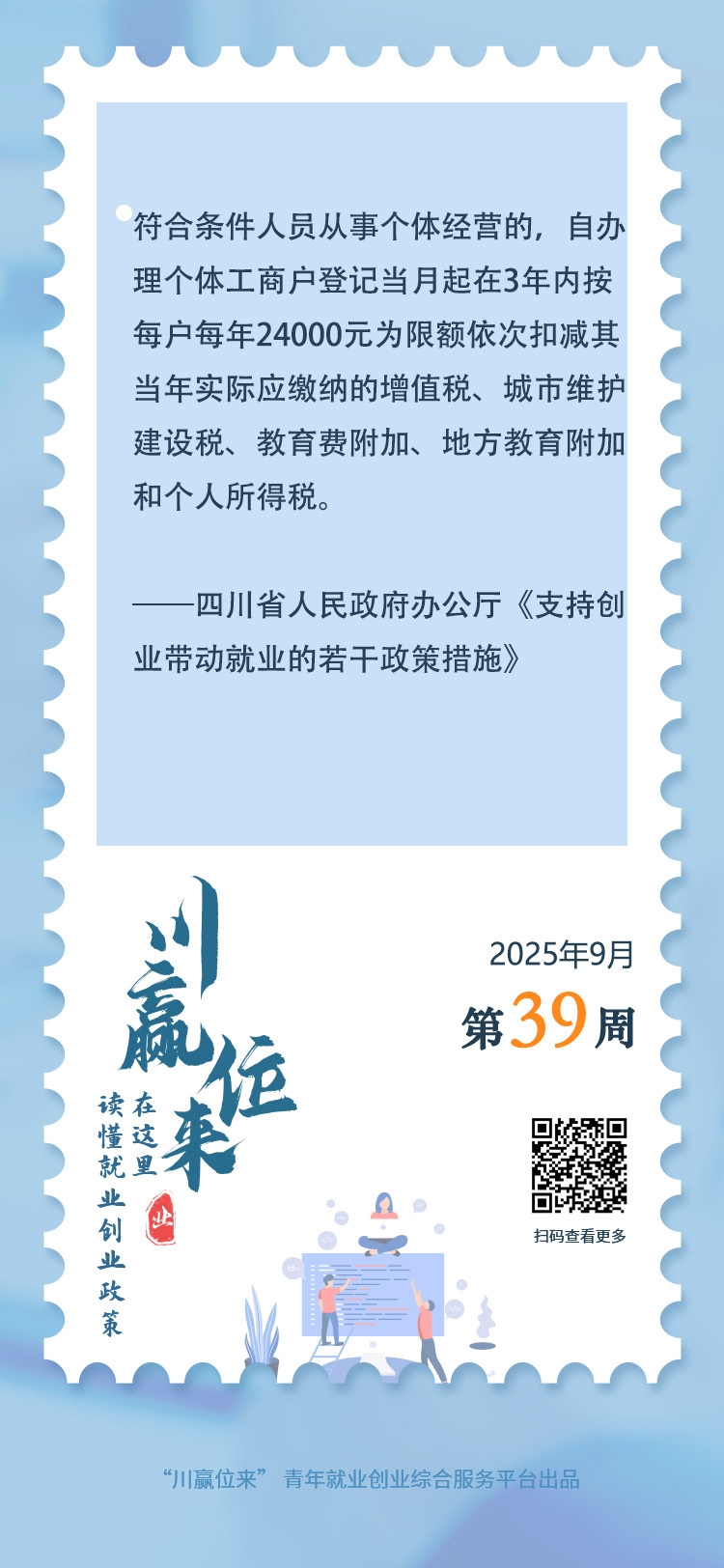 为鼓励创业带动就业,四川省人民政府办公厅《支持创业带动就业的若干政策措施》针对高校毕业生等重点群体自主创业明确了相关税收优惠政策,凡是符合条件人员从事个体经营的,自办理个体工商户登记当月起,在3年内按每户每年24000元为限额依次扣减其当年实际应缴纳的增值税、城市维护建设税、教育费附加、地方教育附加和个人所得税。政策有效期至2027年12月31日。