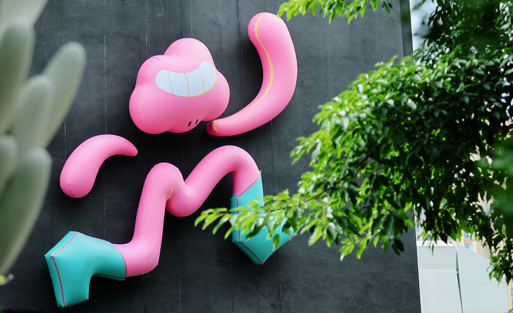 此外,来自吉利学院的大学生耗时一月,创作了本次展览IP——一个全身粉色、脚蹬薄荷绿靴、咧嘴大笑的云朵形象。它活力满满地亮相展馆墙面,以高饱色呼应“脉动”主题,俏皮而可爱,吸睛无数。