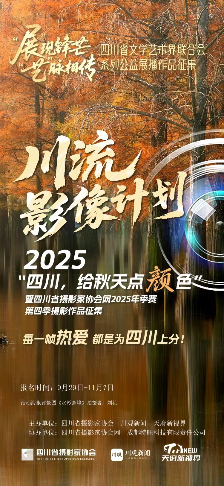 川流影像计划——2025“四川,给秋天点『颜』色”暨四川省摄影家协会网2025年季赛第四季摄影作品征集活动由四川省摄影家协会、川观新闻、天府新视界联合主办,四川省摄影家协会网、成都特旺科技有限责任公司共同协办,无论你用手机、相机、无人机、AI……无论你是摄影作品还是视频大片……无论你拍的是四川风景、人文、民俗文化、人物或其他场景,只要你的“每一帧热爱 都是为四川上分”,就可以报名参赛。