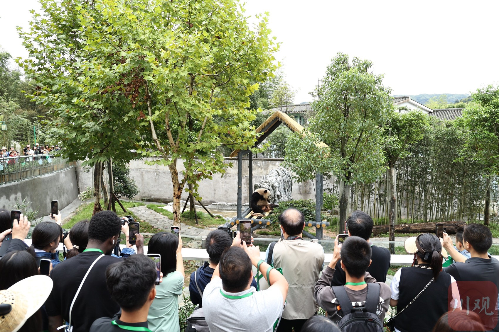 参加开园仪式的嘉宾们集体“围观”大熊猫。
