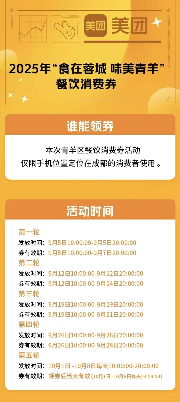 9月5日至10月8日,青羊区将发放“食在蓉城 味美青羊”餐饮消费券活动。满80元减20元、满120元减30元、满200元减50元、满300元减75元、满600减200元……不论小吃、大餐,都有实实在在的优惠,市民游客轻松享受“味蕾自由”。