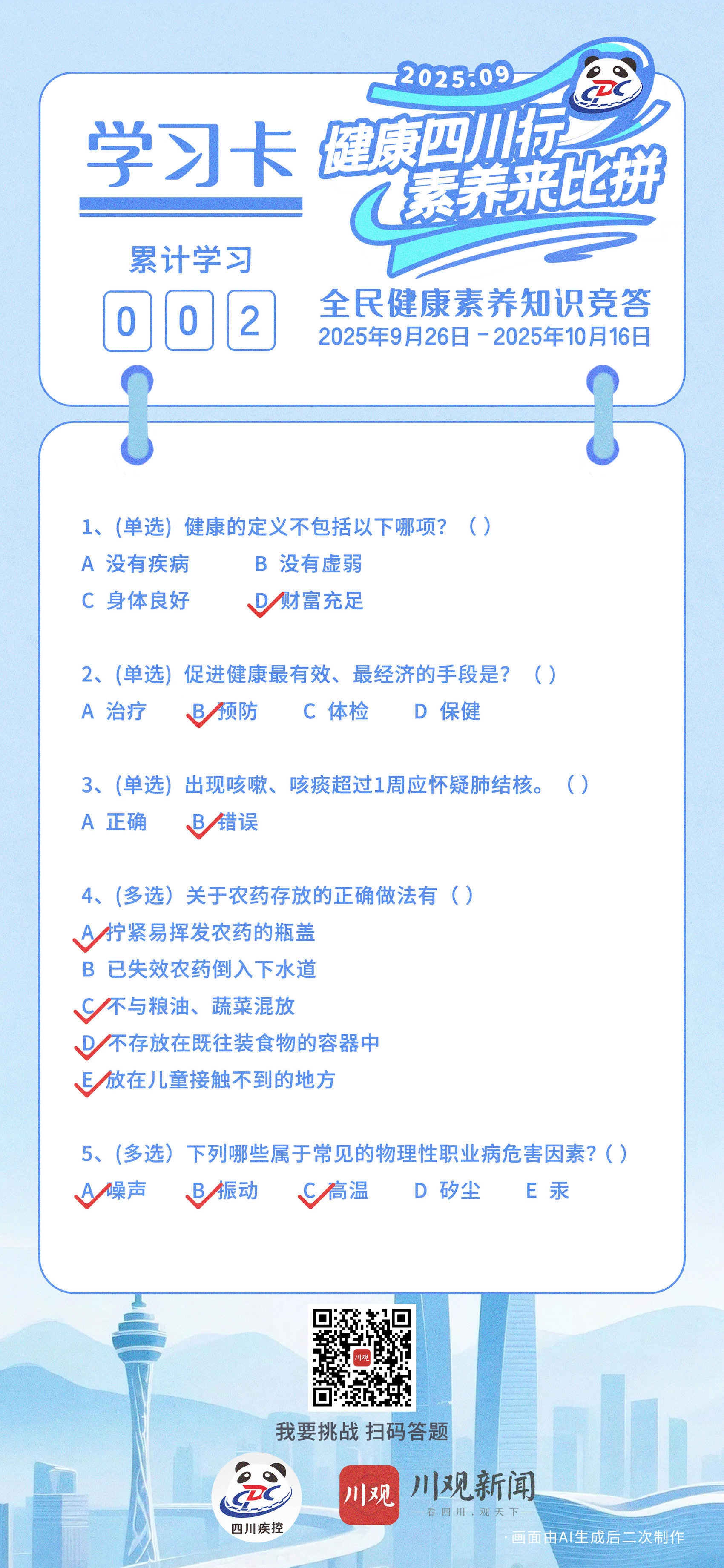 “健康四川行·素养来比拼——全民健康素养知识竞答”活动于9月26日—10月16日举行。活动启动以来,全省参与热情持续高涨。截至9月29日22时,活动已迎来首轮竞争小高峰,市州、区县及个人榜单排名逐渐清晰,同时最新学习卡同步上线,助力参赛者冲刺更高分数。