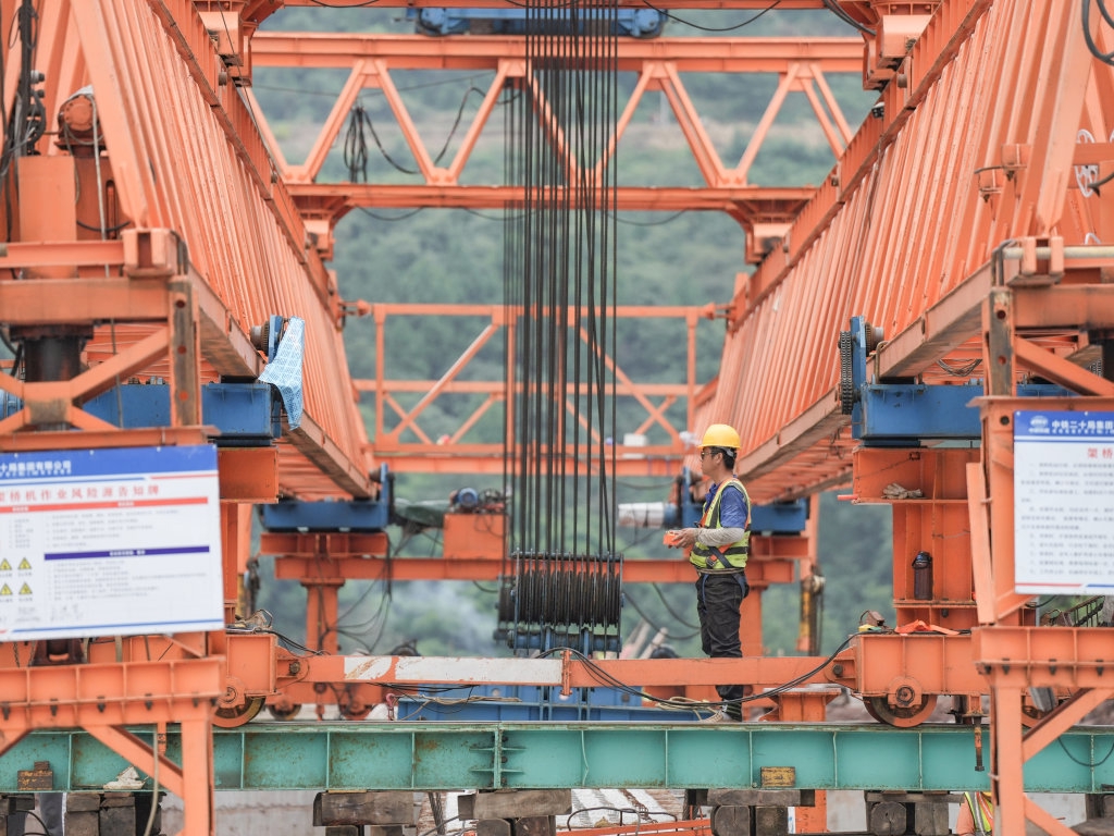 9月30日,工人在成(都)南(充)高速扩容工程叫化岩大桥进行架梁施工。