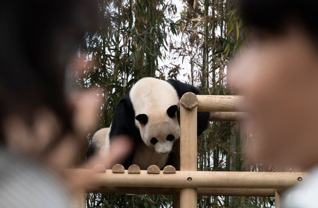 9月30日,游客在韩国龙仁的爱宝乐园观看大熊猫乐宝。