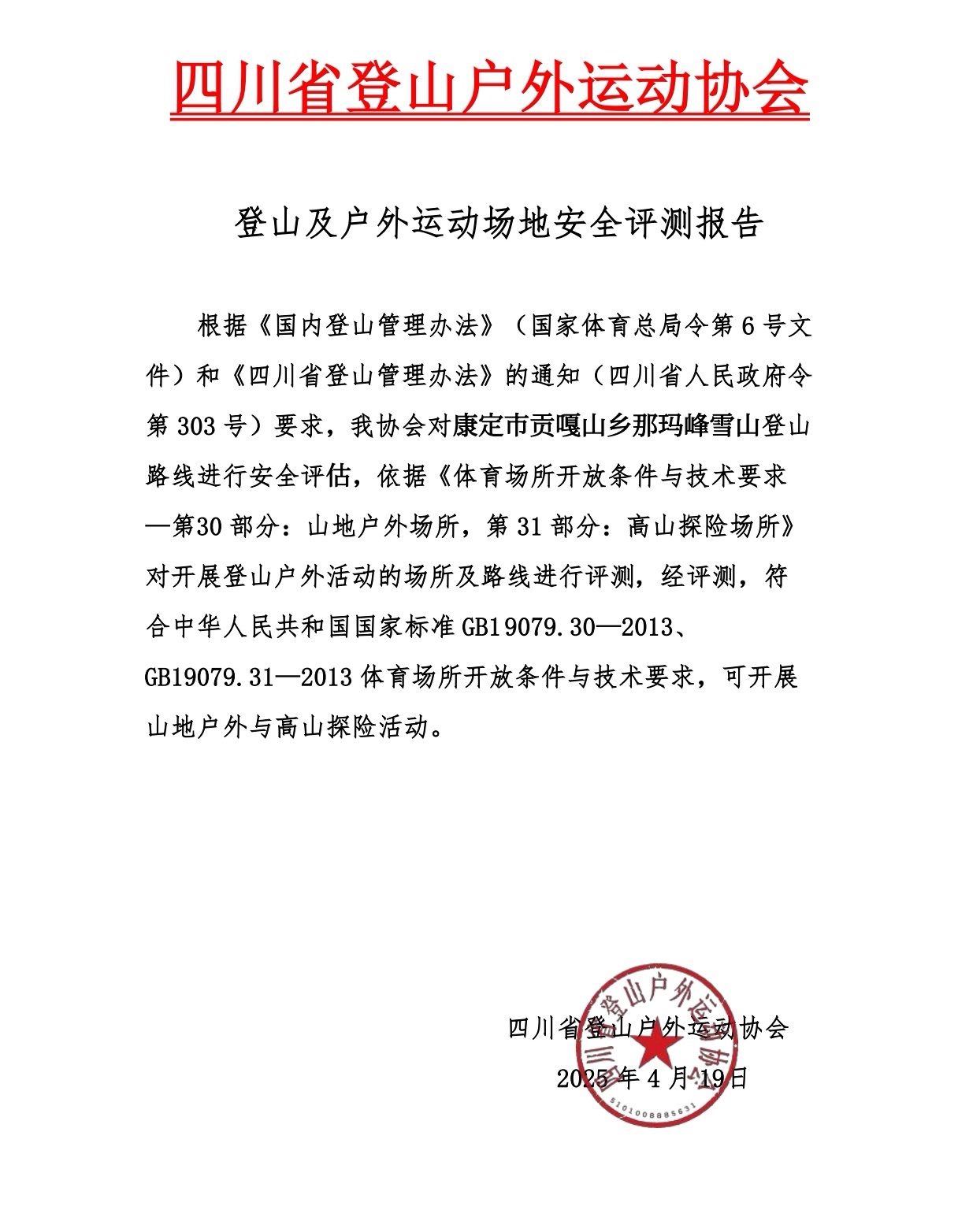 康定市有关部门工作人员还向记者出示了一份《登山及户外运动场地安全评测报告》,报告显示,四川省登山户外运动协会对康定市贡嘎山乡那玛峰雪山登山路线进行了安全评估,经评测,那玛峰可开展山地户外与高山探险活动。