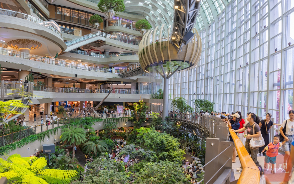游客们在重庆光环购物公园 “光影螺” 内部阶梯行走,感受着繁茂绿植与错落有致的多层商业空间相融所营造出的自然与商业交织的活力氛围。