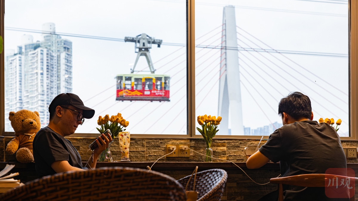 白象居居民楼内的咖啡馆里,游客可一边喝咖啡,一边观赏窗外不断经过的长江索道缆车。
