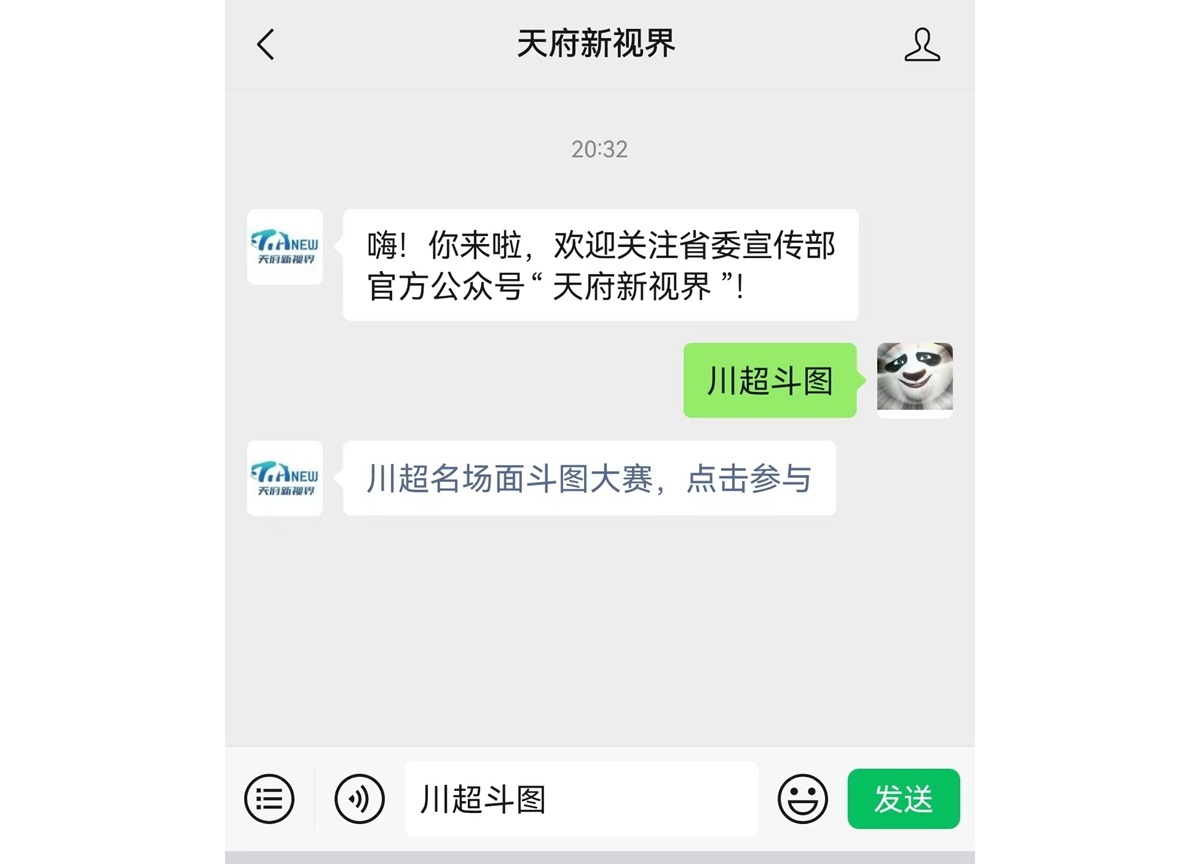 入口四:关注“天府新视界”微信公众号,对话框私信回复【川超斗图】,即可获取活动链接点击参与。