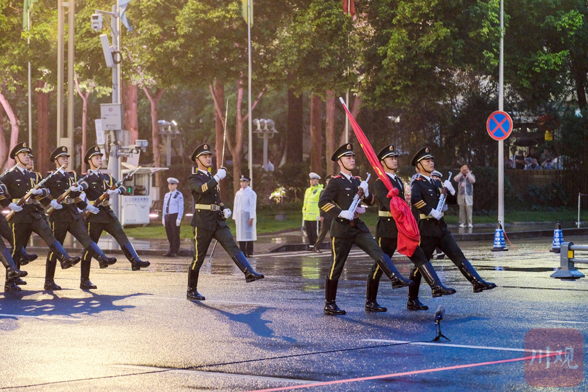 6时55分,口令响起。武警四川省总队成都支队“蓉城国旗护卫队”队员迈着整齐的步伐走入天府广场。6时59分,雄壮的义勇军进行曲奏响。“敬礼!”升旗手将手中的五星红旗抛出,在群众的注视下缓缓升旗。7时,鲜艳的五星红旗在人们深情祝福的目光中升至旗杆顶端,武警战士、公安干警行军礼,少先队员行队礼,现场爆发出雷鸣般的掌声与欢呼,表达对伟大祖国的诚挚热爱与美好祝福。