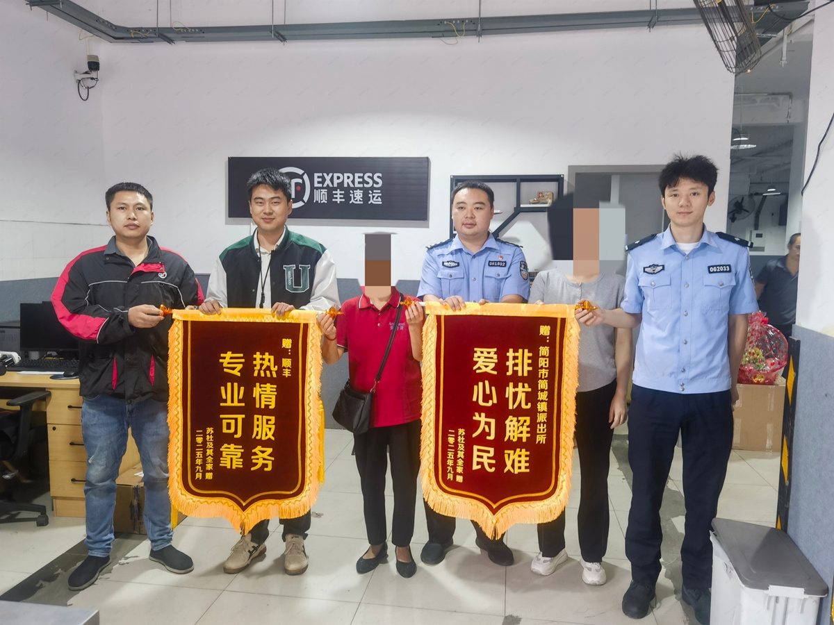9月29日上午,家住简阳的苏大姐及家人专程前往四川顺丰简阳锦江家园营业站致谢,此前,她险些因投资诈骗损失14万余元黄金,正是该站点的工作人员进行紧急协调,帮她全额挽回损失。