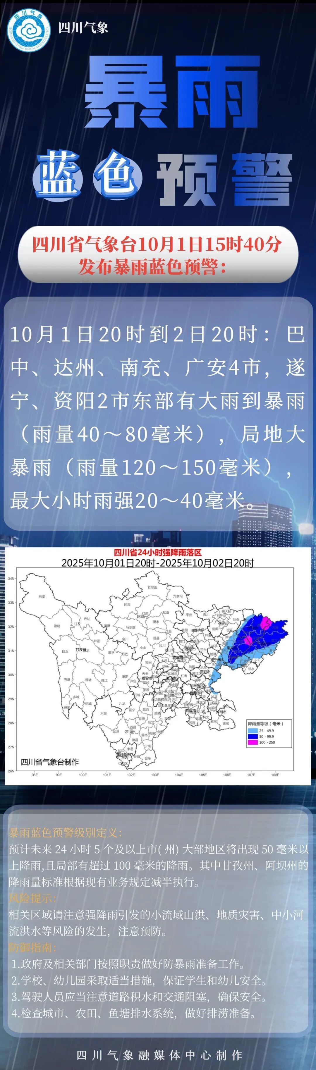 四川省气象台发布暴雨蓝色预警,局地大暴雨