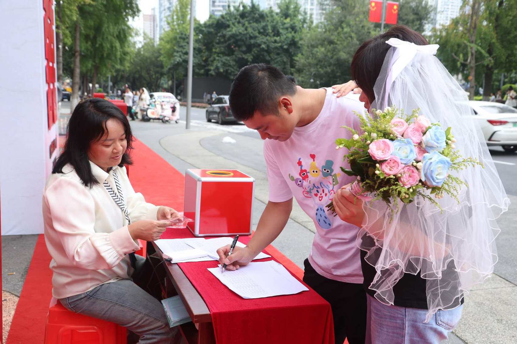 今日,成都23个区(市)县不仅全覆盖设立婚姻登记延时办理点,多地还在国庆节假期举行各类“蓉城囍事”婚俗活动。