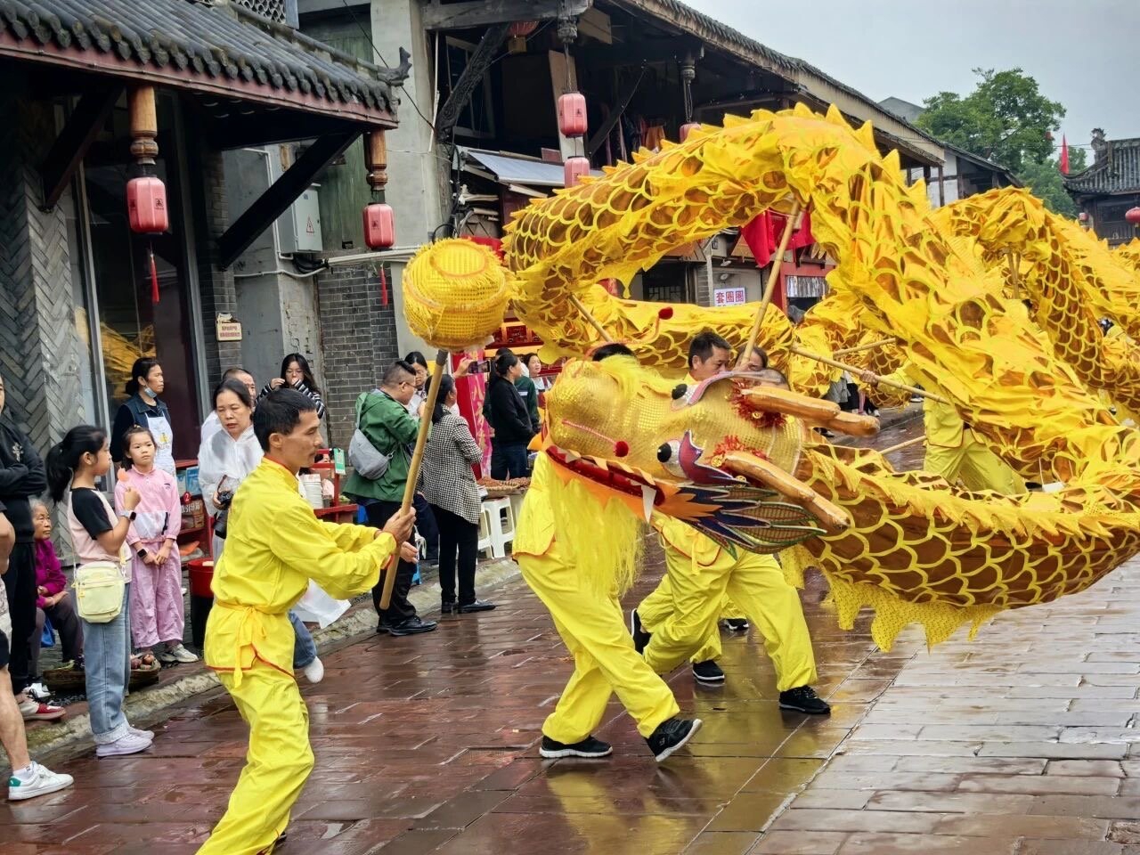 当天上午9点,洛带古镇入口已人潮涌动。铿锵锣鼓声中,一条75米长的巨型金龙,在数十名壮汉合力舞动下“破云而出”,引得观众阵阵喝彩。