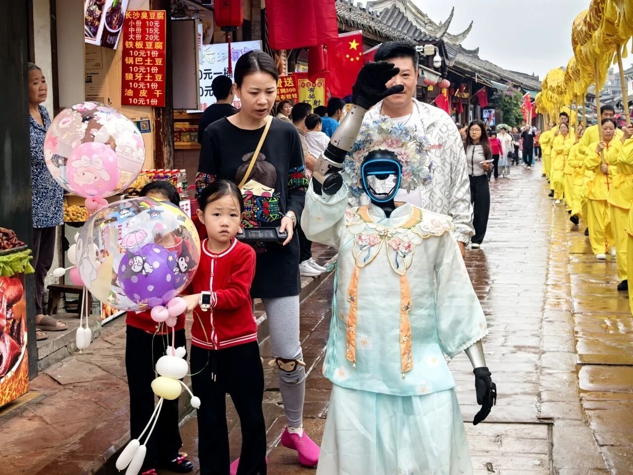 更让人眼前一亮的是,古镇老街上,一台智能机器人头戴簪花巡游,时而驻足向游客挥手问好,时而停下脚步配合拍照,十分灵动。“真没想到机器人也能簪花!这个创意太酷了。”来自重庆的大学生王琳兴奋地表示。