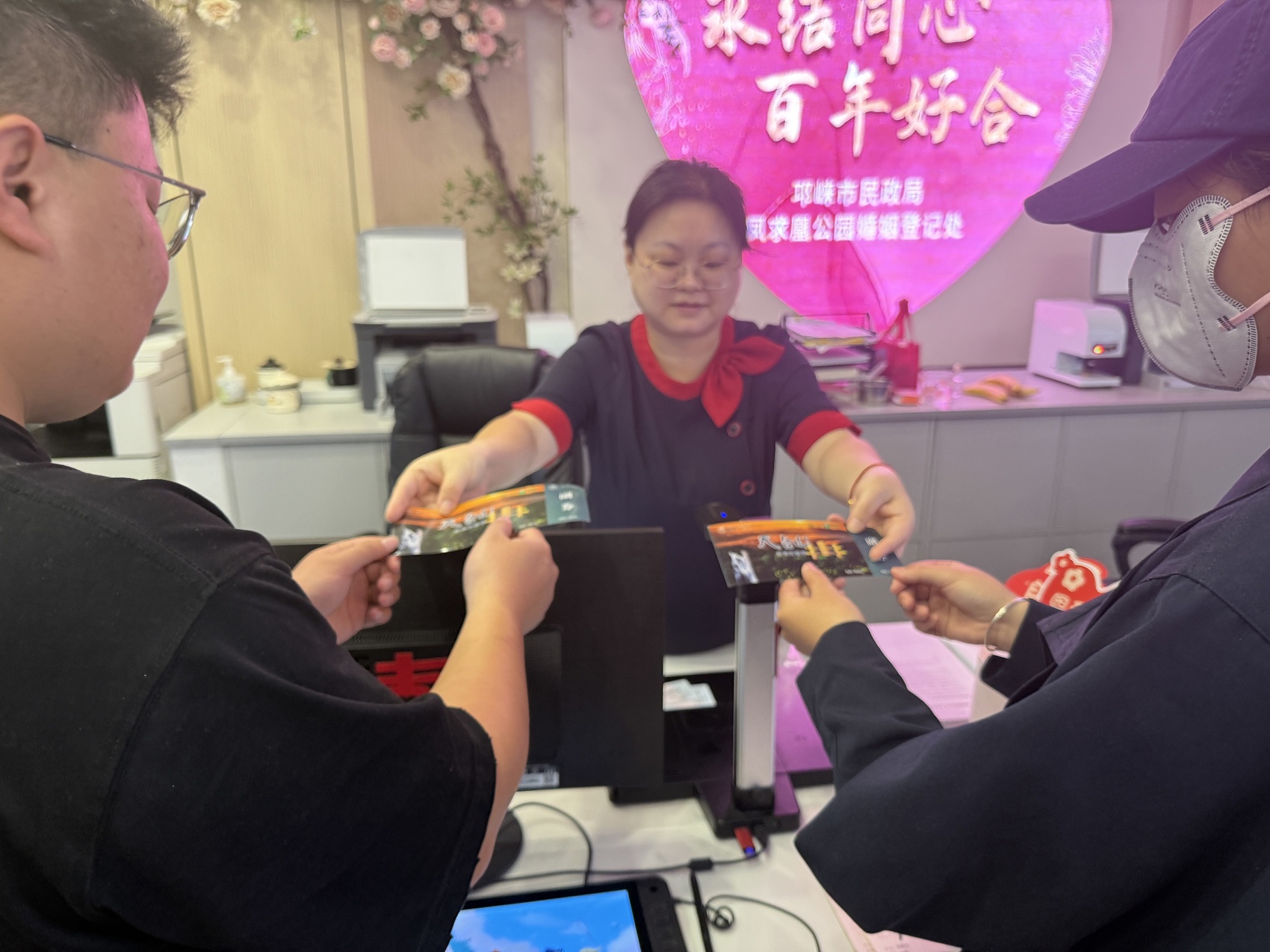 国庆中秋假日期间,邛崃市凤求凰公园婚姻登记处为新人提供婚姻登记延时服务。