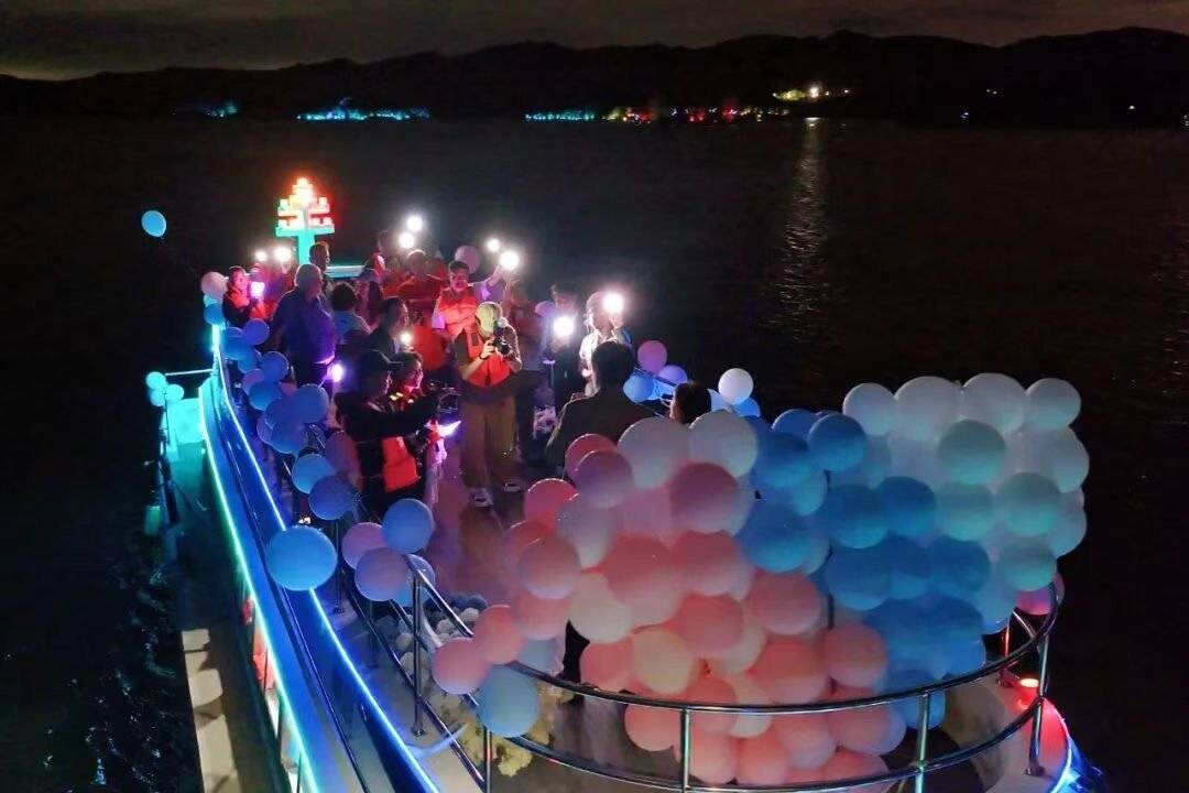 此外,假日期间,全省第二大人工湖泊——三岔湖特别启动了夜游项目,新人们来领证后,可以乘坐游船观赏三岔湖主坝灯光秀,以及“心”形天作之合廊道光影。