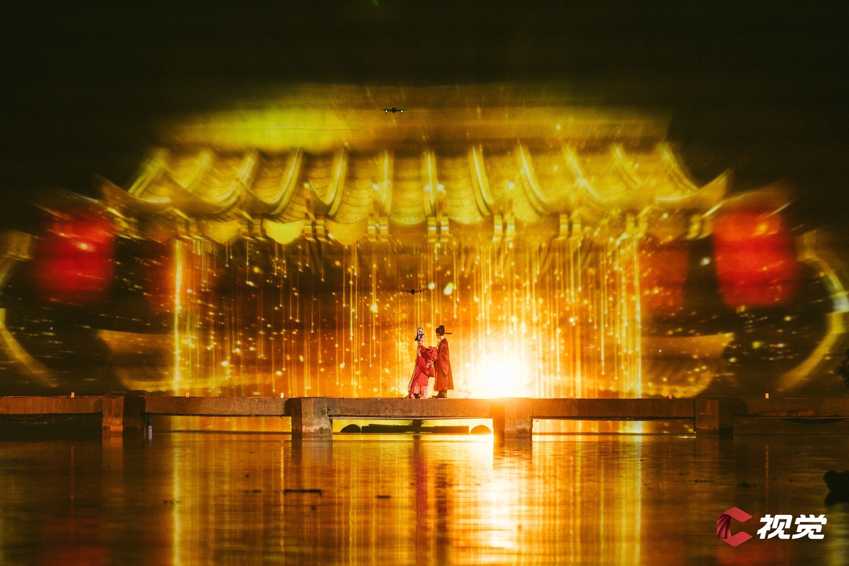 10月1日,夜幕夹关古镇华灯璀璨,光影流转,一声融合非遗与现科技的大型山水实景灯光秀盛大上演,为八方游客献上一场盛大的视觉盛宴。(C视觉签约摄影师 张翔升 摄)