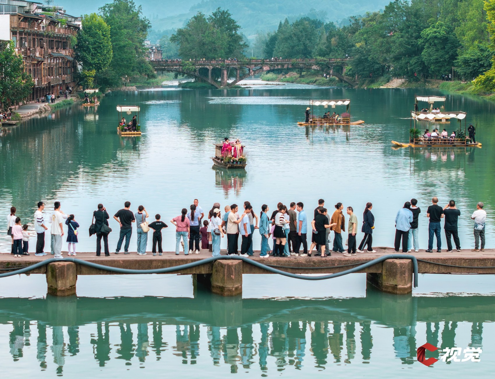 10月1日,成都邛崃夹关古镇国庆期间举办水上婚仪活动,游客聚集观礼。(C视觉签约摄影师 廖芳 摄)