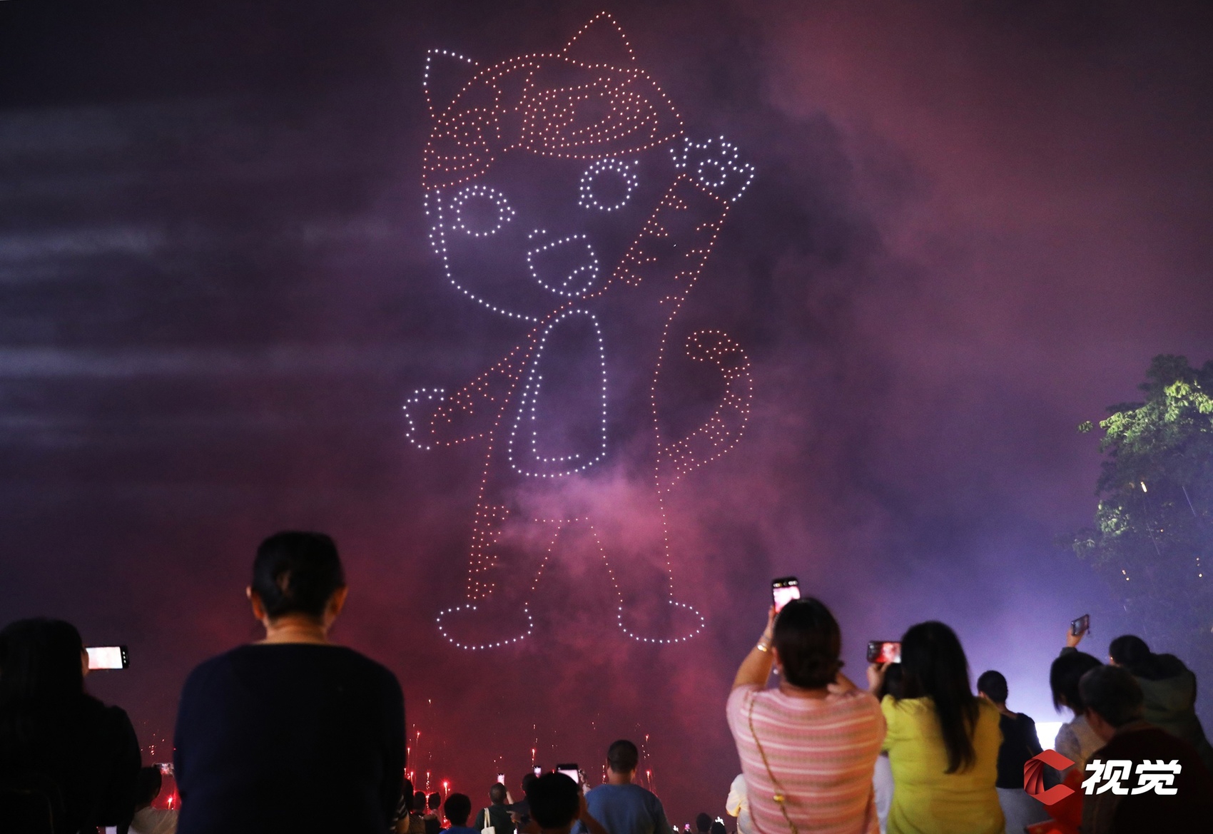 10月1日晚,四川省达州市高新区梨树坪湿地公园,人们在观看烟花和无人机表演。(C视觉签约摄影师 曾猛 摄)