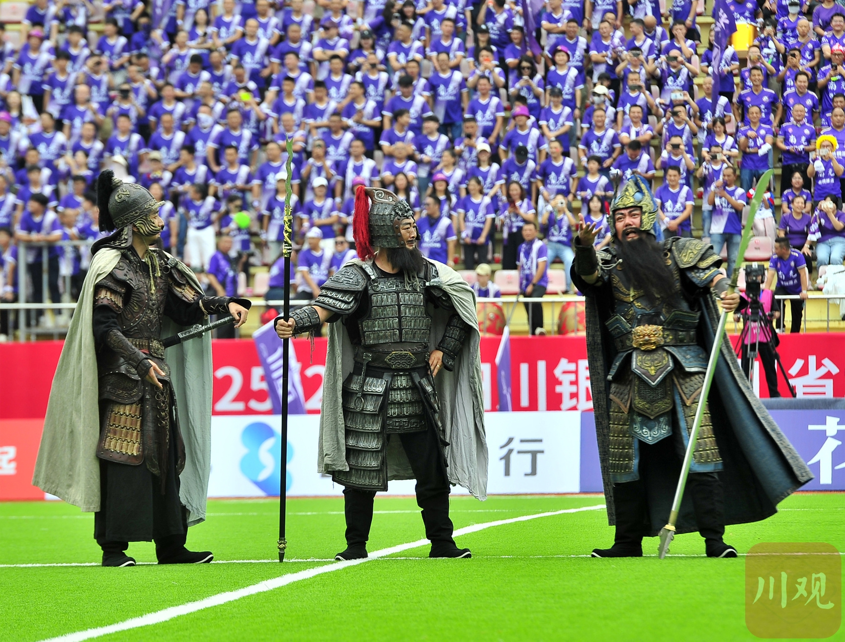 2025年10月6日,“刘备”、“关羽”、“张飞”为南充队助威。(C视觉签约摄影师 乐校臣 摄)