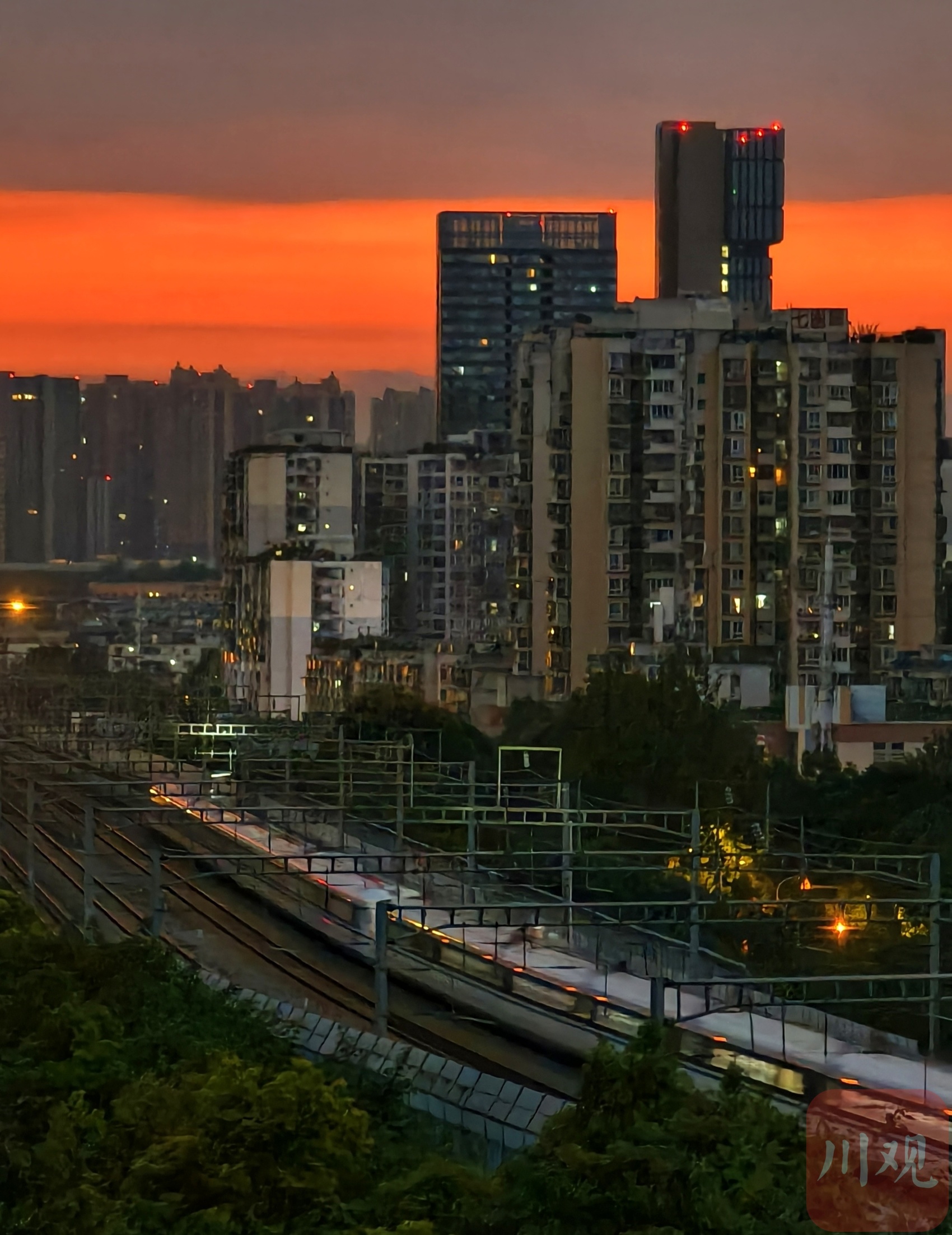 10月7日,假期倒数第二天。成都的清晨被朝霞唤醒,天边的霞光映红了轨道上穿梭的地铁。C视觉签约摄影师 张永杰