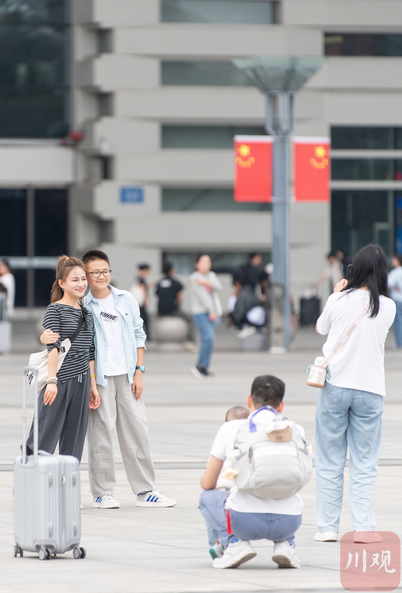 10月7日,游客在成都东站合影留念。C视觉签约摄影师 赵明