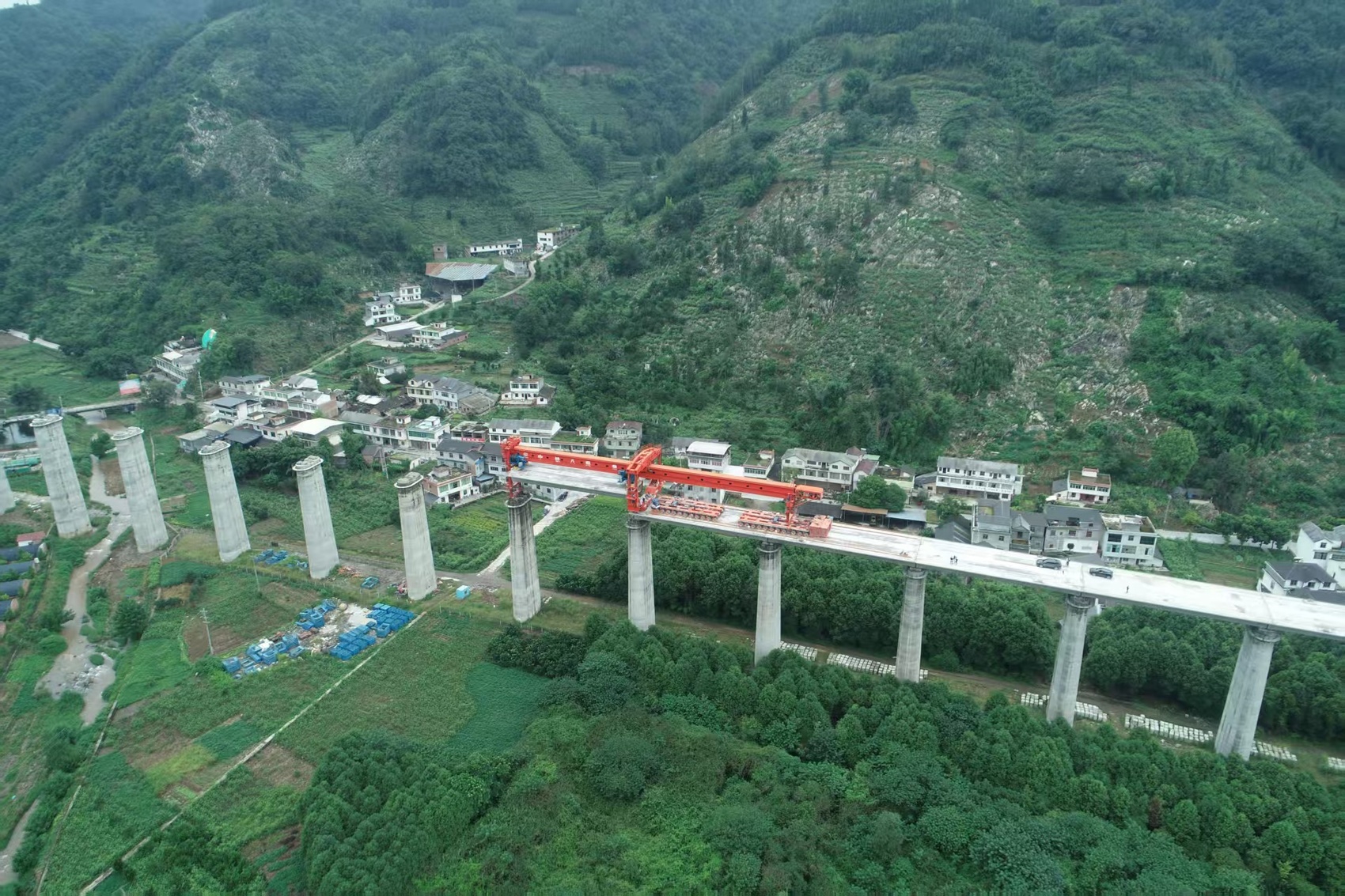 中铁五局工作人员使用架桥机架设西渝高铁谢家院子大桥