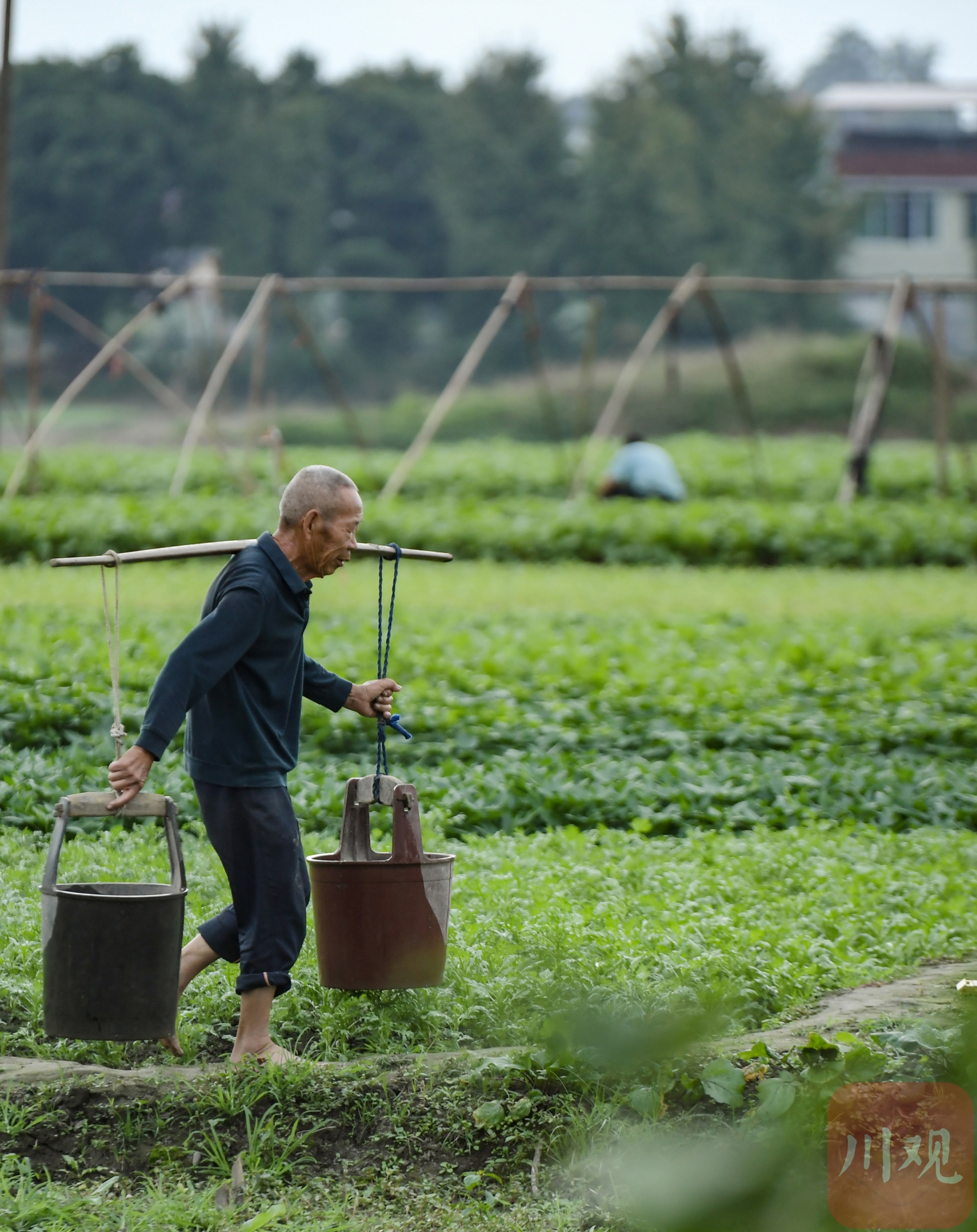2025年10月8日,在成都市双流区永安镇双坝村,当地村民在田间担水。