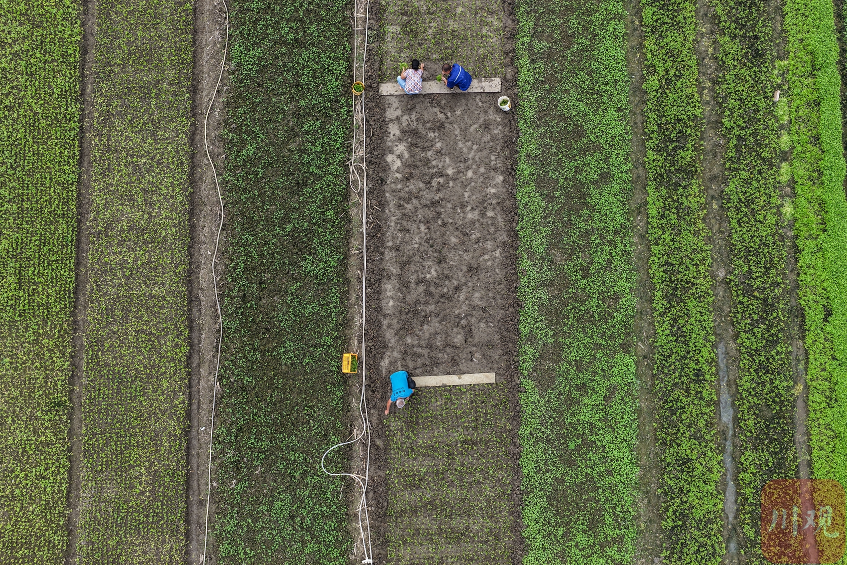 2025年10月8日,在成都市双流区永安镇,当地村民在田间为冬寒菜施肥。